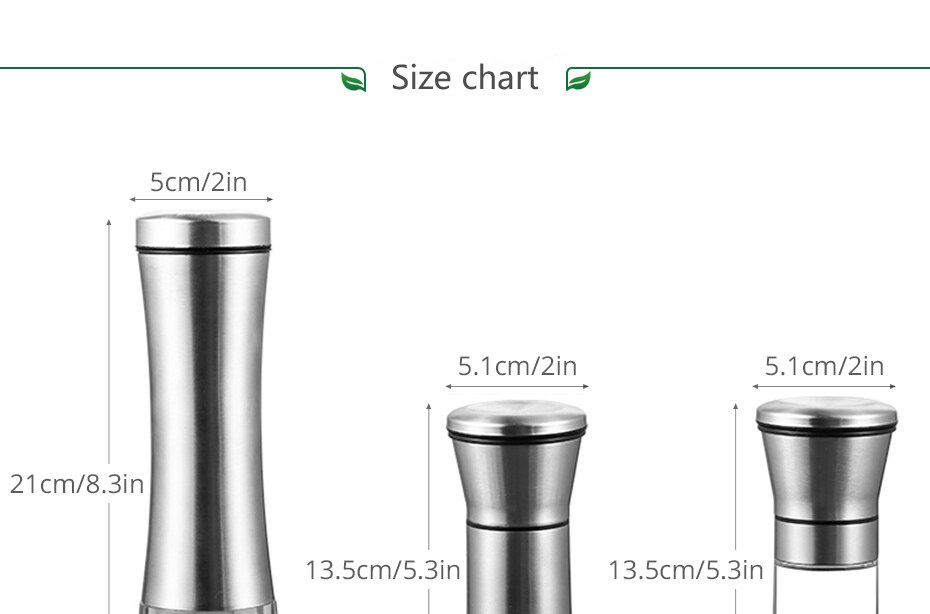 Their height ranges from 5.3in (13.5cm) to 8.3in (21cm), so you can carry this manual spice grinder with you, easily, and enjoy a tasty meal wherever you are!